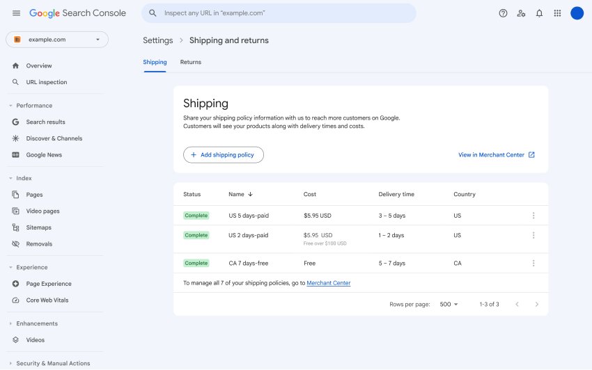 Google amplía también la función de políticas de envío y devoluciones dentro de Search Console. Hasta ahora, esta opción estaba vinculada a tener una cuenta configurada en Merchant Center. Desde las últimas actualizaciones, cualquier sitio identificado como comercio online puede gestionar esta información directamente desde Search Console.